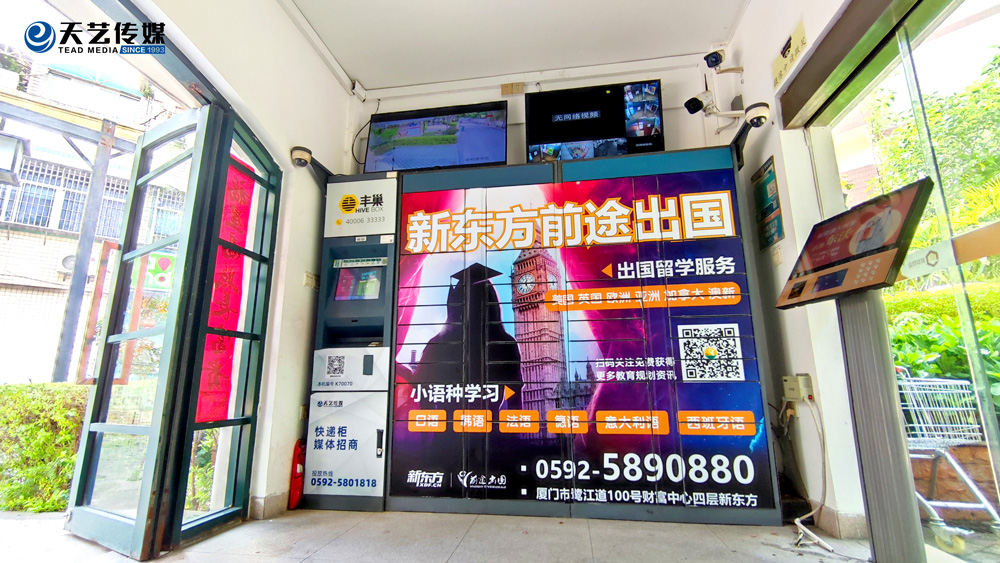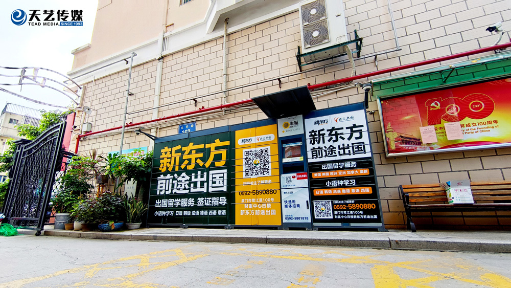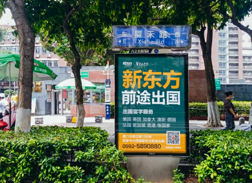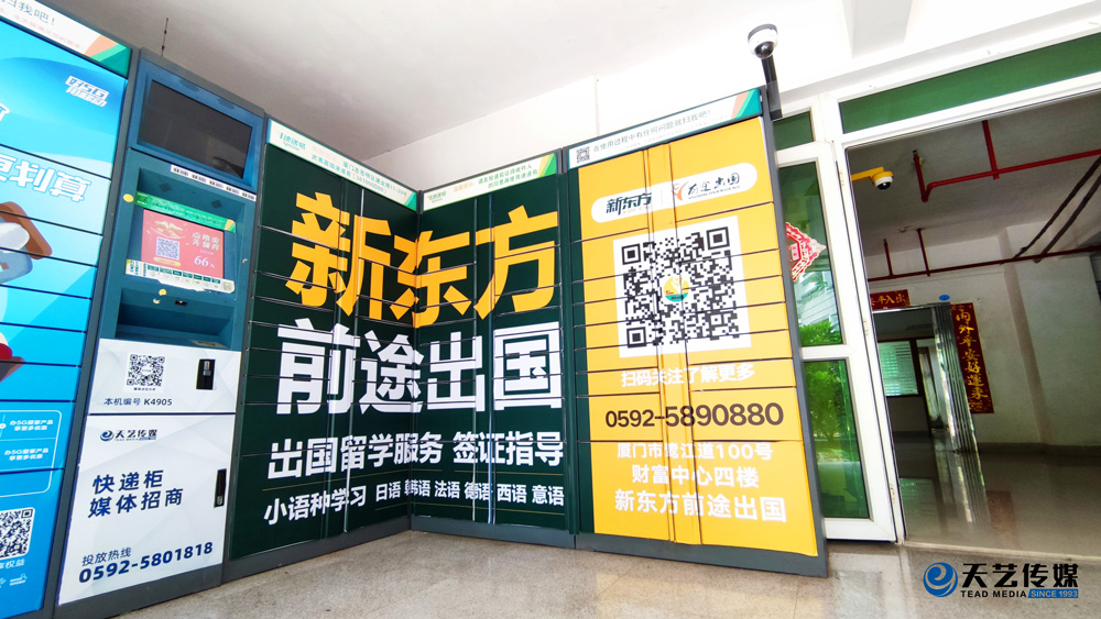 廈門新東方前途出國服務(wù)機構(gòu)位于鷺江道財務(wù)中心四樓,與廈門天藝傳媒合作,目前在主干道路名牌與生活小區(qū)的快遞柜媒體進行部分宣傳合作。