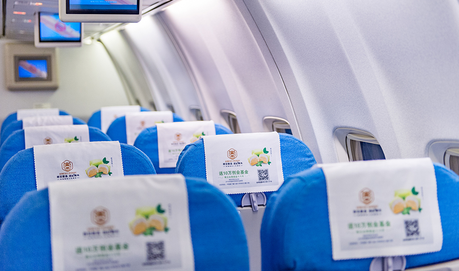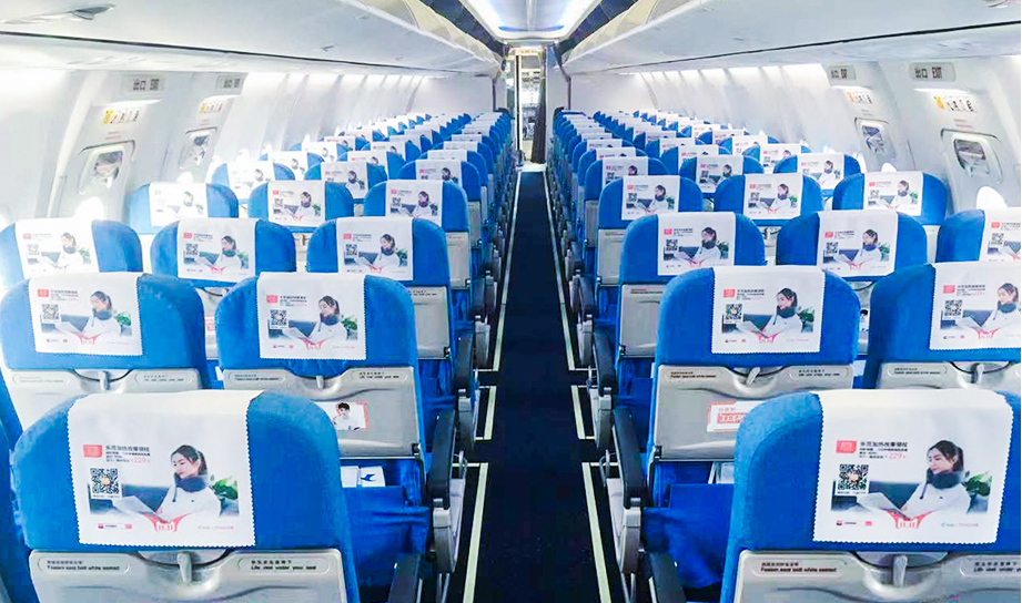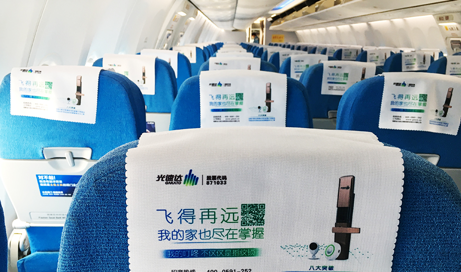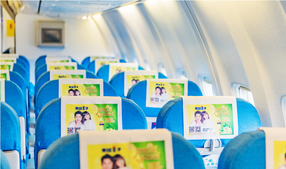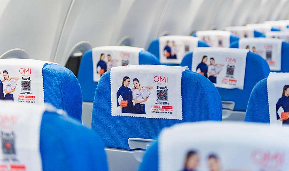 一進(jìn)入機(jī)艙,每個座椅上醒目統(tǒng)一的頭片廣告,全艙集中呈現(xiàn),營造出一種沖擊力極強(qiáng)的視覺