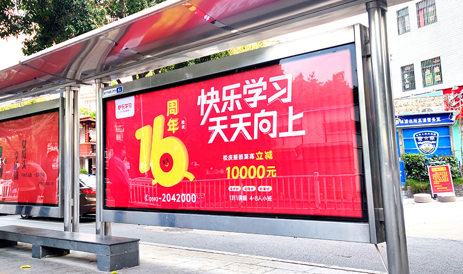 介紹:快樂學(xué)習(xí)作為廈門本土知名教育企業(yè),候車亭范圍覆蓋中小學(xué)周邊,讓學(xué)生和家長近距離感受戶外廣告畫面效果。