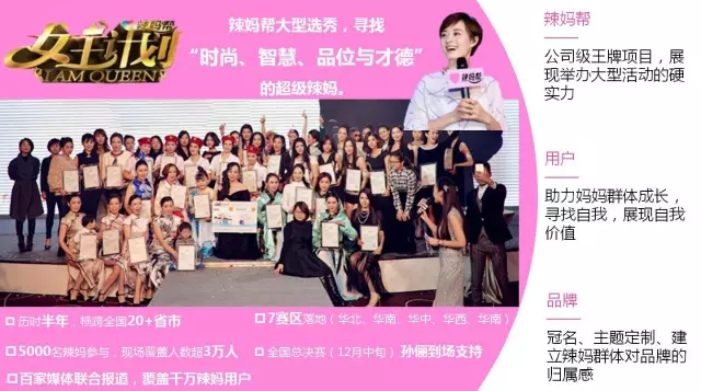 辣媽幫自2015年起與全國婦聯(lián)展開了為期五年的獨家合作,希望通過此舉打通全國醫(yī)務渠道,尋找到源頭用戶,將孕媽媽人群培養(yǎng)成為孕期伴侶、辣媽幫用戶,并通過社區(qū)固定用戶行為,利用辣媽商城、荷花親子將其有效轉(zhuǎn)化為購買人群。辣媽幫與全國婦聯(lián)的深度合作,每年將影響到1500多萬的孕媽媽,而這其中500多萬人會被轉(zhuǎn)化為辣媽幫用戶。