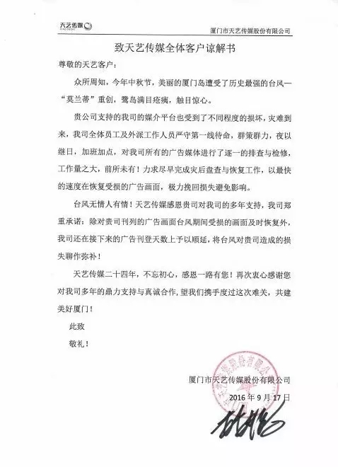 臺風無情人有情!天藝傳媒感恩貴司對我司的多年支持,我司鄭重承諾:除對貴司刊列的廣告畫面臺風期間受損的畫面及時恢復外,我司還在接下來的廣告刊登天數上予以順延,將臺風對貴司造成的損失聊作彌補!